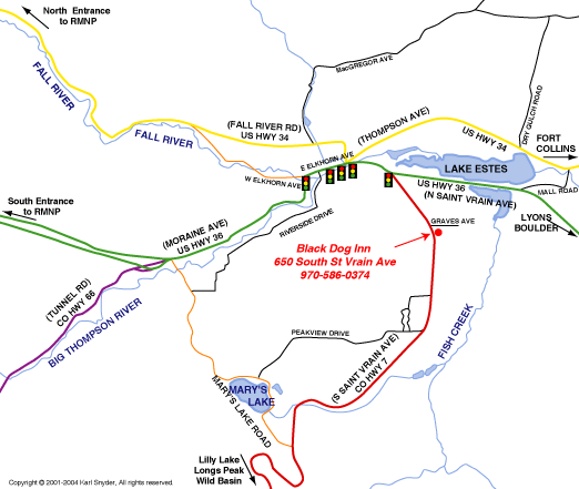 - Turn right on Hwy 36 in Lyons (20 miles to Estes Park).